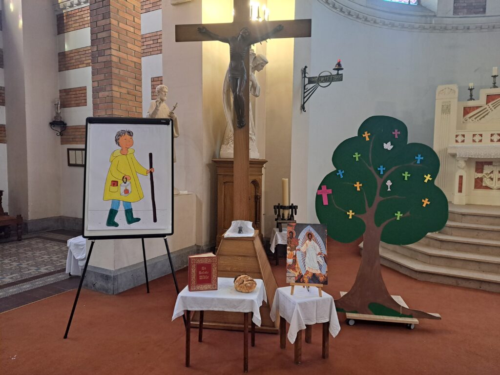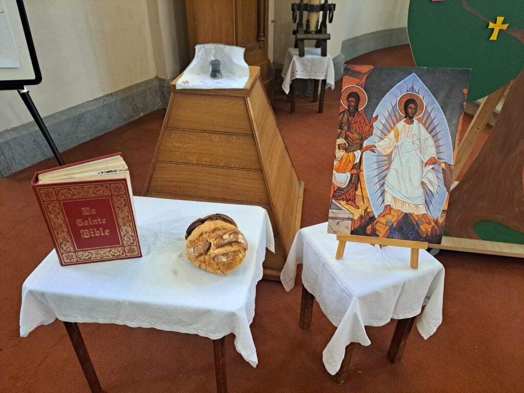 Autour de la croix nous avons déposé les cendres (mercredi des cendres) ,  un pain et une bible le 1er Dimanche  (l’homme ne vit pas seulement de pain mais de toute parole qui sort de la bouche de Dieu )  et de l’image de la transfiguration le second Dimanche (Jésus est  rayonnant, il retient notre attention et nous invite à la prière).