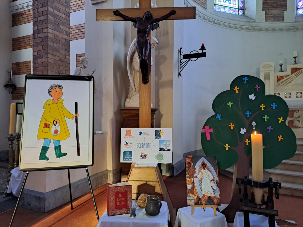 une bougie le 4ème Dimanche ( invitation au passage des ténèbres à la lumière ) et un panneau portant les logos des principales associations le 5ème Dimanche ( invitation à la solidarité)