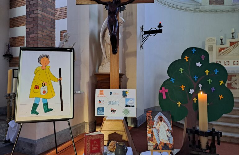 une bougie le 4ème Dimanche ( invitation au passage des ténèbres à la lumière ) et un panneau portant les logos des principales associations le 5ème Dimanche ( invitation à la solidarité)