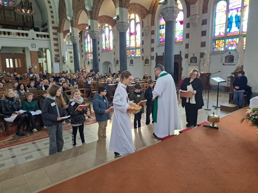 Ce Dimanche 8 février les enfants qui se préparent à la communion  ont reçu au cours de la messe dominicale  à St Vaast  le nouveau testament  en bande dessinée.